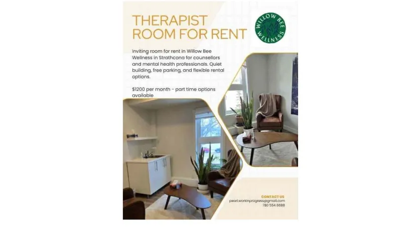Willow Bee Wellness offers a furnished therapy office available full-time or part-time in a quiet professional setting. Free parking, shared waiting area, Wi-Fi, and convenient access near Whyte Ave. Ideal for psychologists and counsellors building or expanding their practice. $1200 per month for full time use, part time options available. Contact Pearl at 780 554 6688.